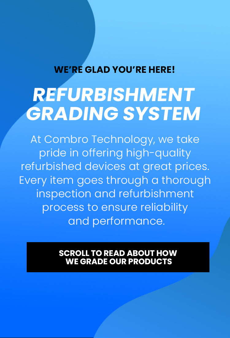 At Combro Technology, we take pride in offering high-quality refurbished devices at great prices. Every item goes through a thorough inspection and refurbishment process to ensure reliability and performance. To help you make an informed decision, we've categorized our devices into three distinct grades based on their cosmetic condition and functionality. Whether you're looking for a like-new device or a budget-friendly option, our grading system ensures transparency and confidence in your purchase.